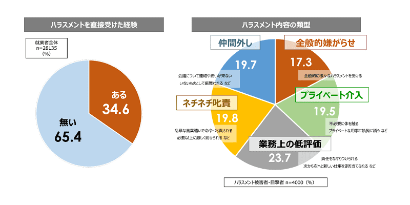 パーソル総合研究所の「職場のハラスメントについての定量調査」によれば、全就業者の34.6%が、過去に職場にてハラスメントを受けたことがあると回答しています。3人に1人が経験していることから、ハラスメントはとても身近な問題であることが分かります。
