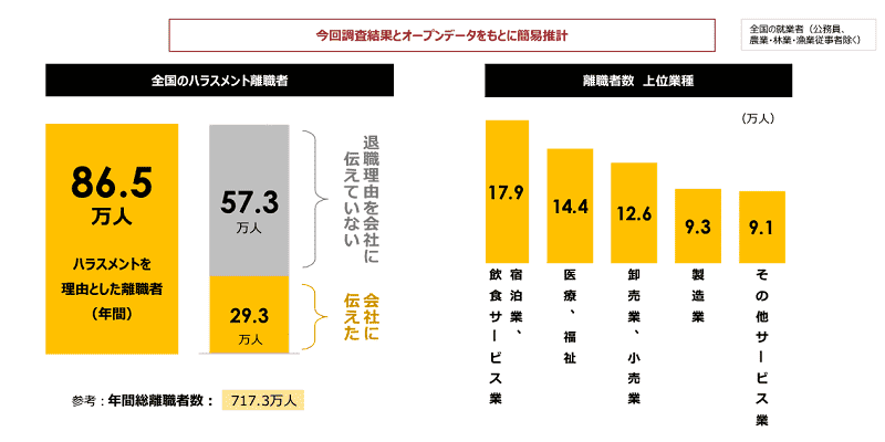 例えば、パーソル総合研究所の「職場のハラスメントについての定量調査」によると、ハラスメントを原因とする離職者は年間86.5万人と判明しています。さらにそのうちの半数以上が、退職理由を会社に伝えられないまま離職している現状も明らかになりました。