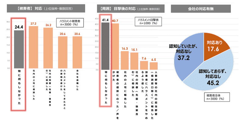 さらに同調査では、ハラスメント目撃者の4割、そして会社の8割がハラスメントに対し何も対応していないことが判明しています。