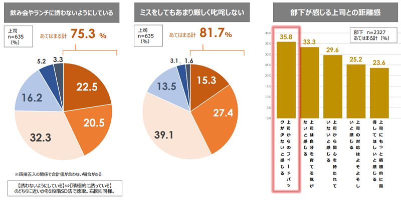 パーソル総合研究所の調査ではハラスメントと扱われることを恐れて、「部下を飲み会にあまり誘わない」「部下がミスをしても厳しく叱咤しない」といった回避的なマネジメントを行う上司が増えていることが分かります。